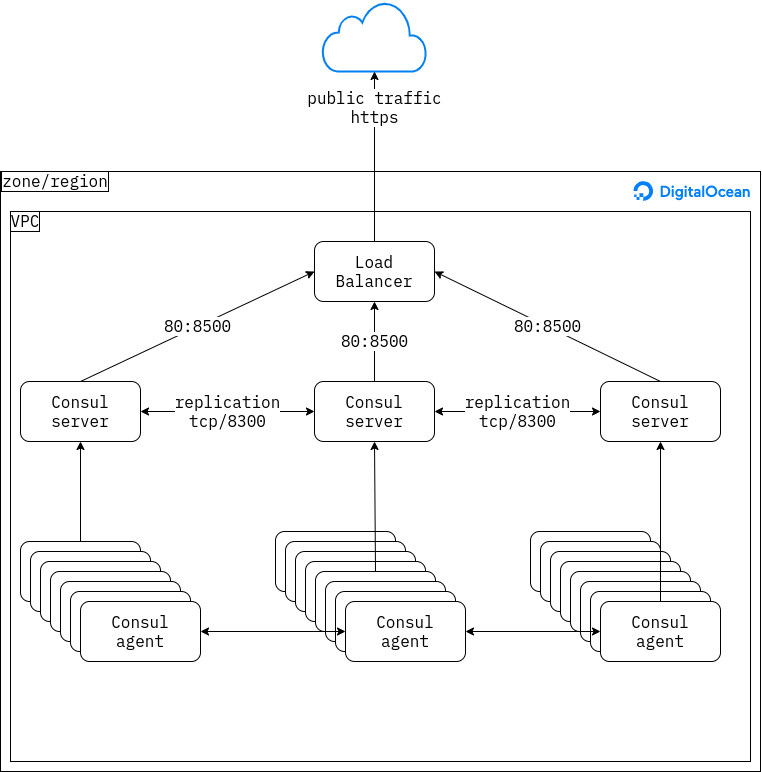 Following the tutorial, the idea would be to create a set of droplets for the servers, a set of droplets for the agents, and a load balancer to front the servers2. These would all be included in a VPC to allow the agents and servers to communicate with each other over a local network. Cloud firewalls would then protect the instances by allowing only traffic on the Consul ports