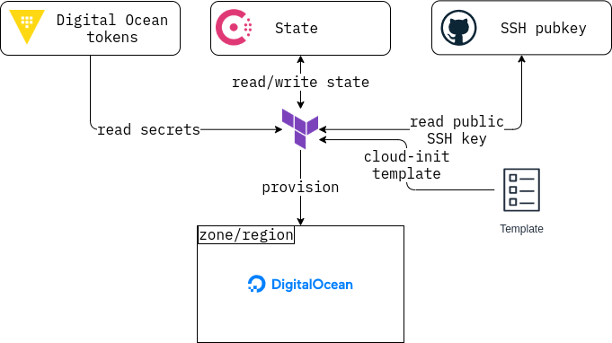 - The choice of storing the state in a Consul backend is predetermined. I used Consul because I have access to one in Hashi@Home, but an S3-compliant object store state could have been used, for example a DigitalOcean space. This is both cost-effective and simple, but has to exist before we can run a plan, just like the Consul backend.