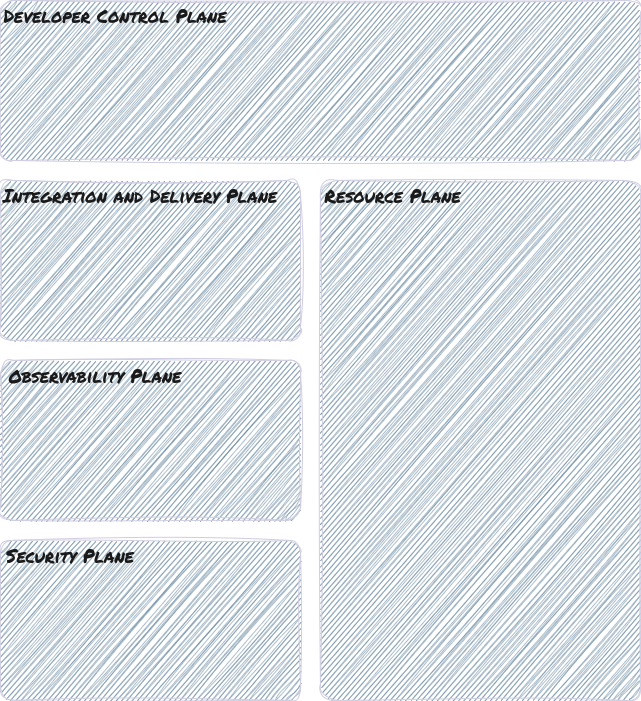 Developer Control Plane: Contains all necessary tooling for developers to build applications. This includes version control for applications and the platform infrastructure’s source code. In mature cases, it includes an internal service catalogue and API gateway that developers use to identify reusable components and avoid duplication.
